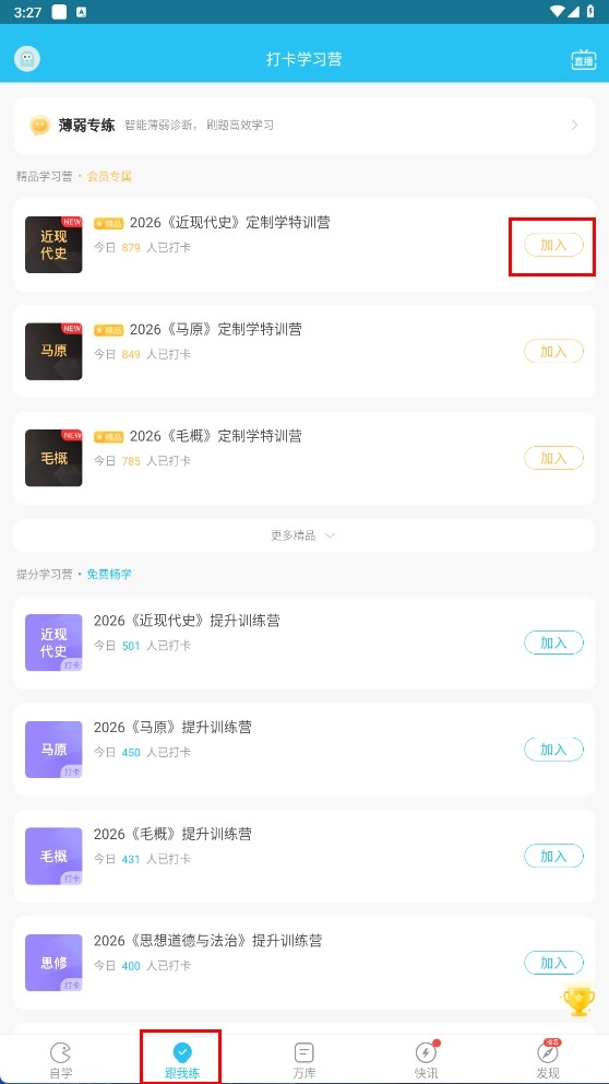 4、进入【跟我练】页面,点击学习营右侧的【加入】按钮,即可参与对应的学习营。