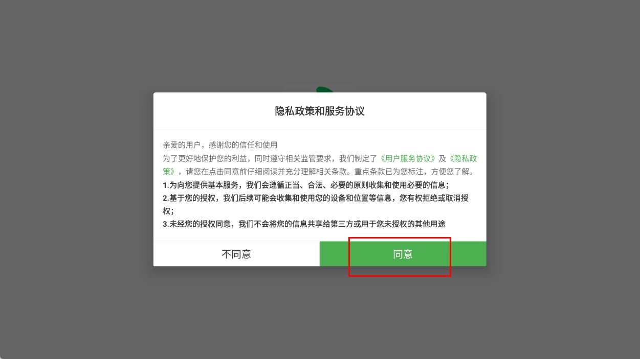 1、点击【同意-隐私政策和服务协议】按钮,进入登录界面。
