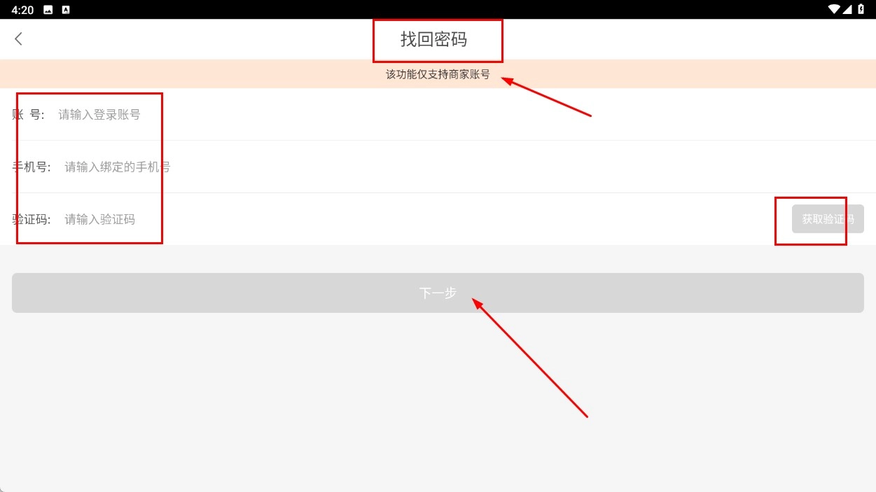 3、要是忘记了密码,可进入找回密码页面,输入【账号】和【手机号】,获取并填写验证码后,点击下一步按钮即可。