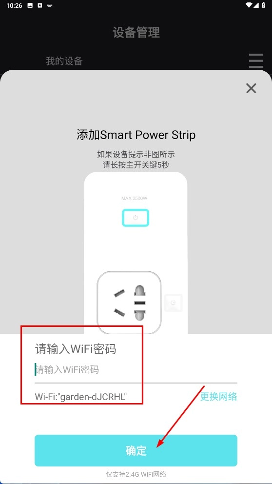 4、输入WIFI密码后,点击【确定-功能按钮】,即可完成设备添加时的网络配置步骤。