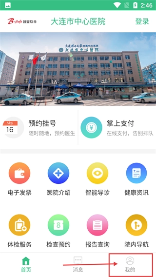 在【大连市中心医院】软件首页,点击右下角的【我的】选项,就能进入个人中心页面。