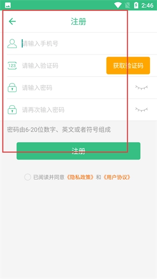 4、进入注册页面后,按顺序填写手机号、验证码、密码,并且再次确认密码,就能完成账号注册操作。