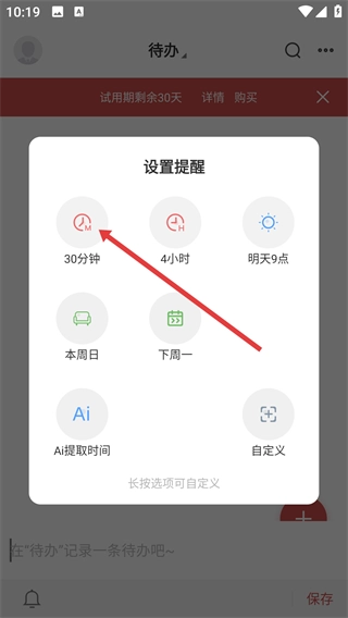 在提醒列表的设置里,选择【30分钟】这类提醒时间选项,就能完成待办事项提醒时间的设置。