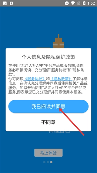 2、请仔细阅读《个人信息及隐私保护政策》,阅读完毕后点击“我已阅读并同意”按钮,以此确认您同意使用龙江人社提供的相关服务。