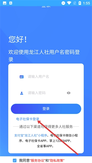 3、进入登录界面后,点击【电子社保卡登录】选项,通过电子社保卡的方式完成龙江人社的登录操作。