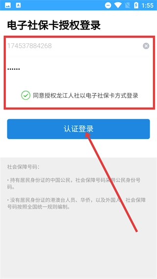 4、进入电子社保卡授权登录页面后,填写所需信息并同意授权,随后点击【认证登录】按钮,即可完成电子社保卡的登录流程。