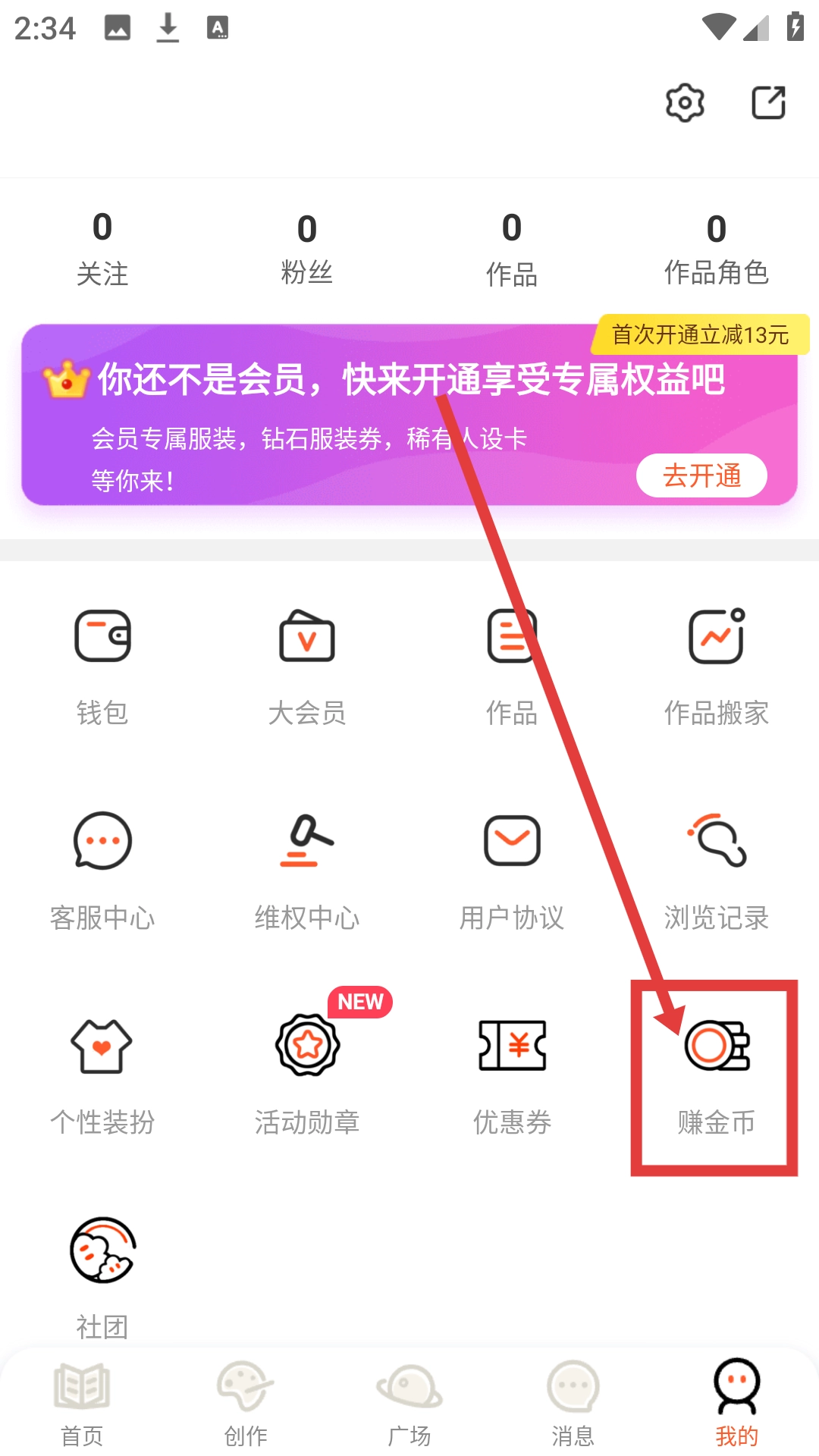 1、进入“我的”页面后,点击【赚金币】选项,就能进入赚金币页面完成任务获取金币啦。
