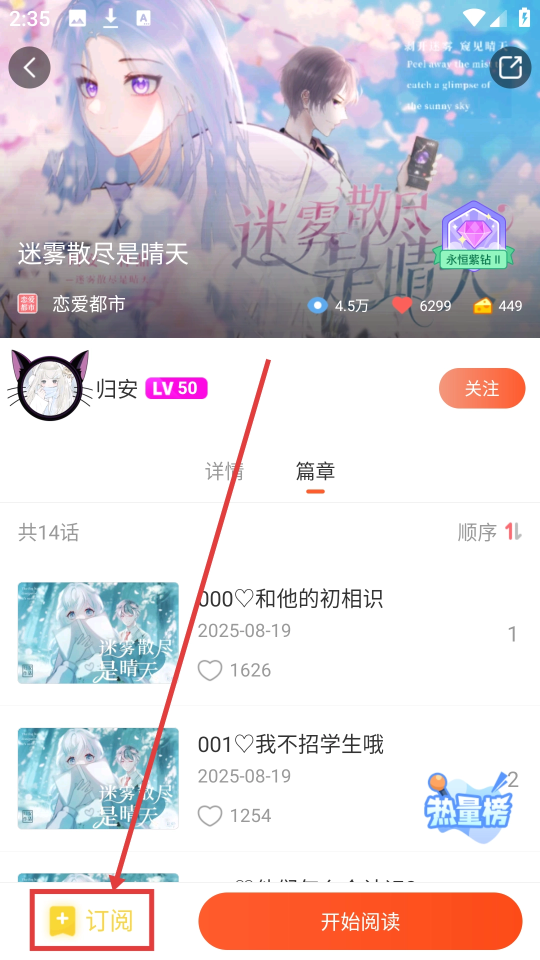 3、进入作品页面后,点击【订阅】按钮,这样就能完成订阅作品的任务啦。