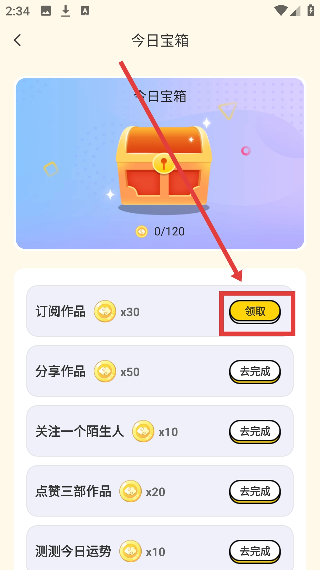 4、完成订阅作品的任务后,返回赚金币页面并点击“领取”按钮,就能成功领取30金币了。