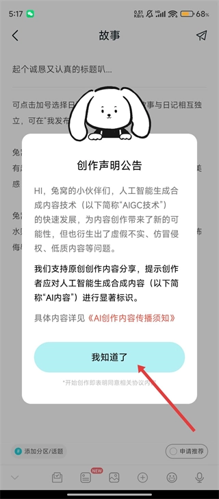3、进入后会弹出【创作声明公告】,点击【我知道了】,就能开始编辑故事内容了。