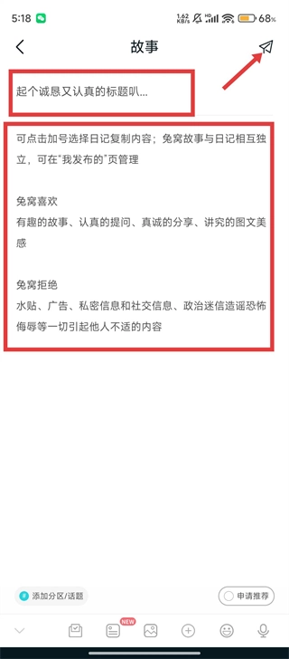 4、进入故事界面后,依次填写【标题】与故事内容,检查确认信息无误后,点击发送按钮,即可完成帖子发布,把自己的故事分享出去啦。
