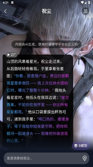 这里提供了形形色色的AI角色,它们拥有各异的背景设定、所属次元、年龄区间、性别属性以及兴趣偏好等。你还能根据自己的心意自定义这些参数,让每一处细节都精准契合你的喜好。不仅如此,每个角色都配备了独特的语音系统,为你带来沉浸式的互动聊天体验。