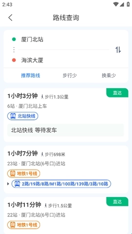 3、能够迅速查询到厦门市的公交线路信息、公交换乘方案、公交车实时位置,以及各线路的首班车与末班车时间。
