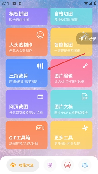 1、在“功能大全”页面,点击“压缩裁剪”选项。