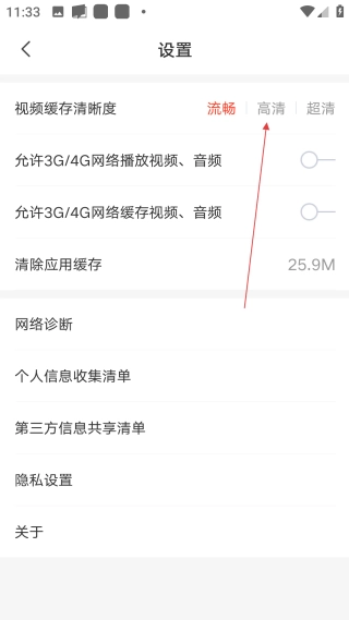 4、进入设置界面后,找到【视频缓存清晰度】的功能参数进行调整,就能完成缓存清晰度的设置操作。