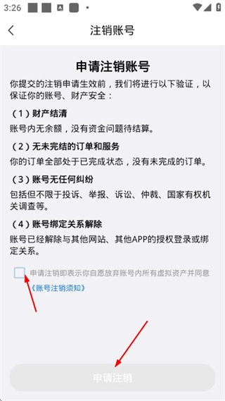 5、进入账号注销页面后,勾选相关须知内容,就能点击“申请注销”按钮来推进账号注销流程。