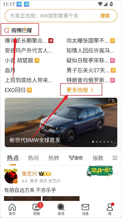 2、在发现页的顶部或中间位置找到【热搜】入口,就能查看实时热搜总榜。要是想查看更多分类榜单(比如文娱榜、同城榜),点击【更多热搜】就能进入完整页面。