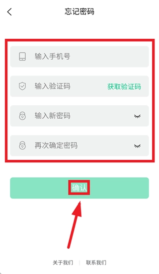 在忘记密码页面,依次输入手机号、验证码和新密码后,点击确认按钮就能完成操作。