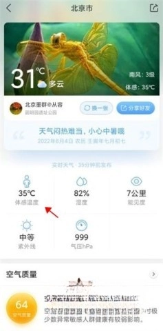 2、这时能够进一步看到体感温度、湿度、能见度以及气压等数据。