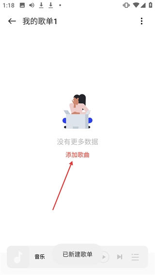 4、进入新建的歌单(我的歌单1)后,点击【添加歌曲】按钮就能添加歌曲。