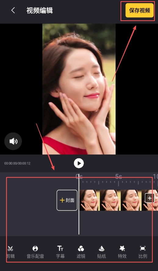 4、进入剪辑界面后,底部会呈现出各类用于视频剪辑的工具,使用这些工具完成剪辑操作后,点击保存视频按钮,即可将剪辑完成的视频保存下来。