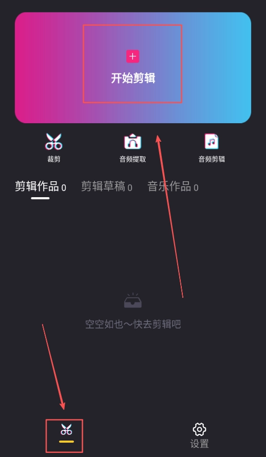2、完成协议确认并进入软件首页后,在首页显眼位置找到“开始剪辑”按钮,用手指点击该按钮,即可进入视频剪辑的准备界面。