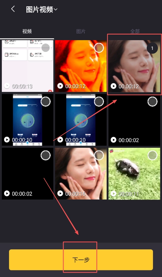 3、进入准备界面后,从手机的视频列表中选择要进行剪辑的视频文件,选中视频后点击页面下方的“下一步”按钮,即可进入剪辑界面。