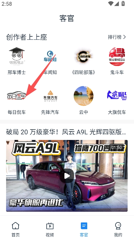 1、进入客官板块,选择每日侃车等创作者。
