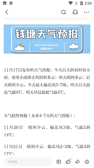 在钱塘天气专区,能够查看不同日期的钱塘天气预报列表,点击“11月17日钱塘天气预报”即可进入详情页面。