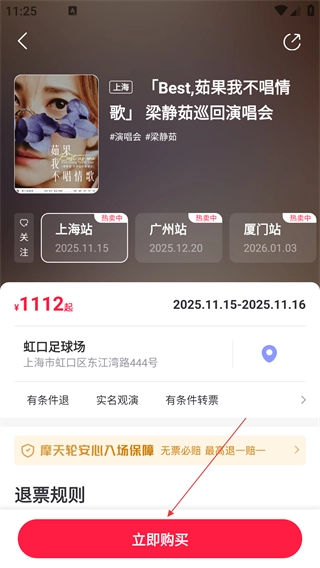 3、进入演唱会详情页面后,点击【立即购买】按钮,即可跳转至场次选择界面。