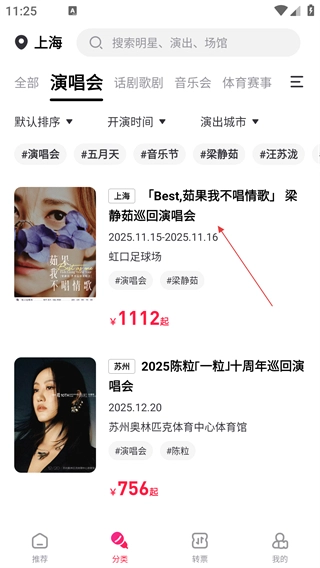 1、进入推荐页面后,点击【演唱会】选项,即可进入演唱会列表页面。