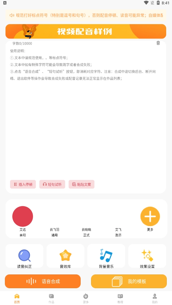 支持插入停顿,读音纠正,可添加背景音乐及音效