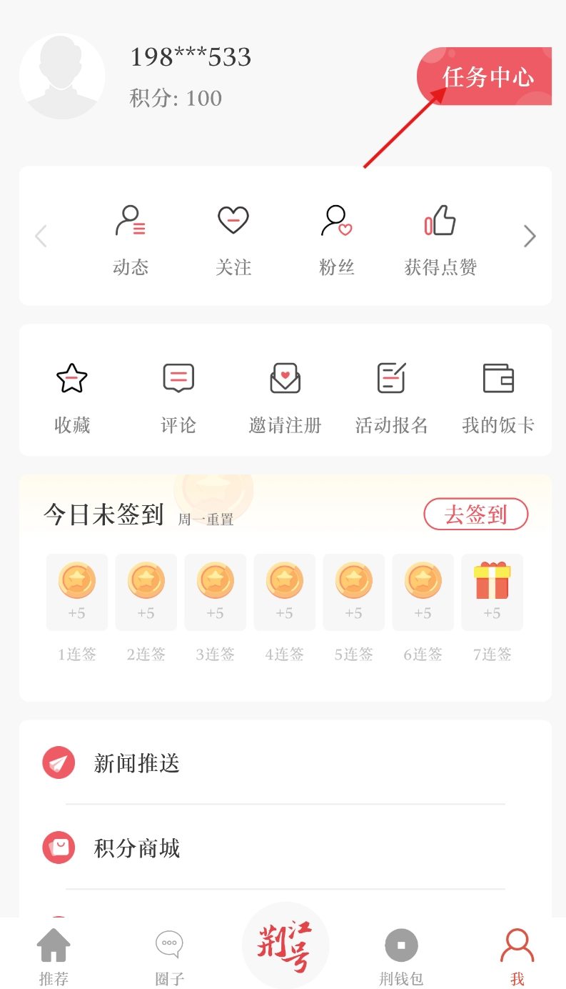 2、进入个人界面后,找到“任务中心”板块,点击进入每日任务和签到专区。