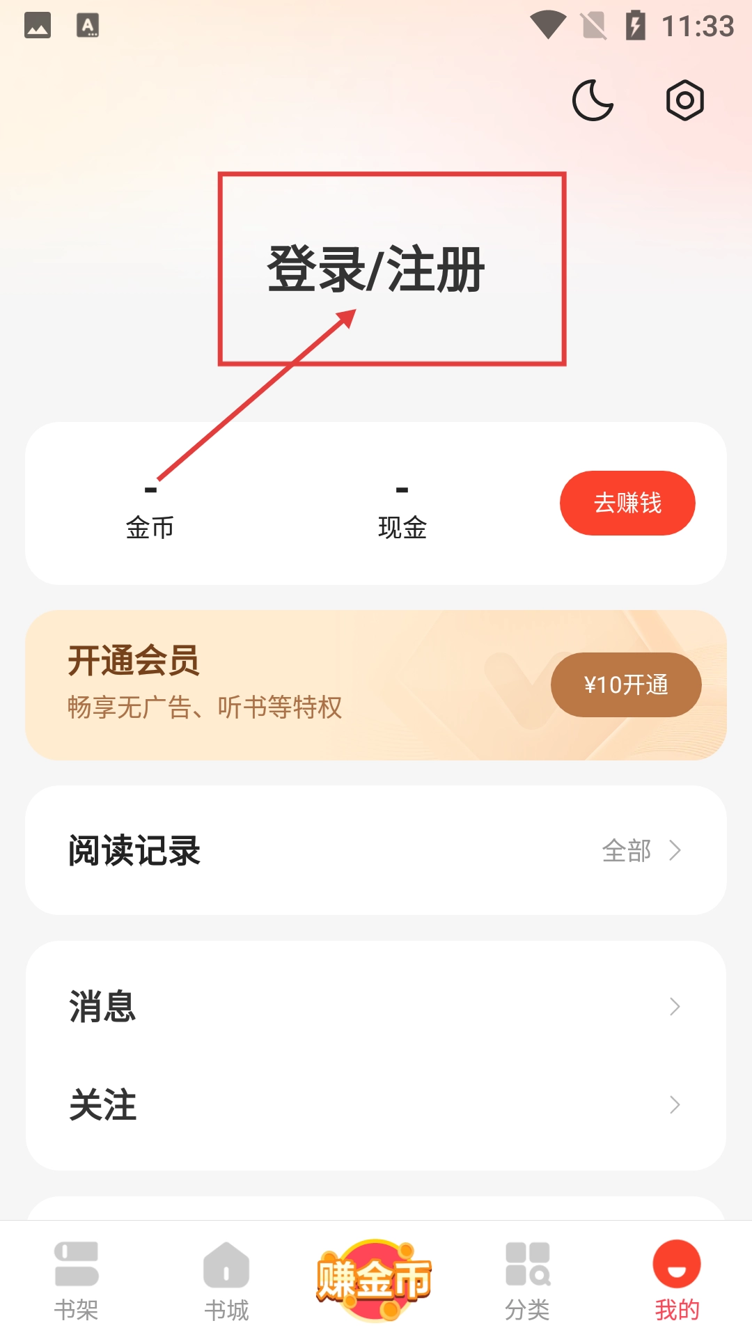1、在小说软件的书城页面,点击右下角的【我的】按钮,就能进入个人中心页面,开展登录、注册等相关操作。