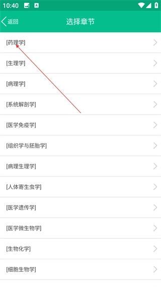2、进入章节选择页面后,找到并选择【药理学】这一科目,即可进入对应的科目题库。