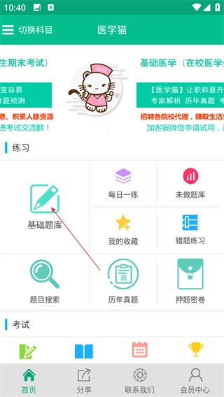 1、打开医学猫软件后,在首页找到并点击【基础题库】选项,即可进入题库选择页面。