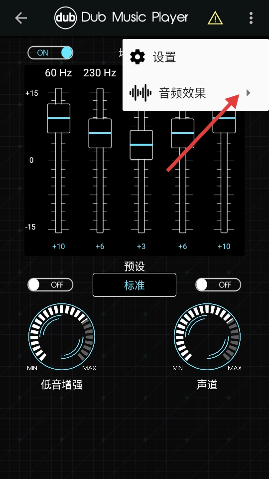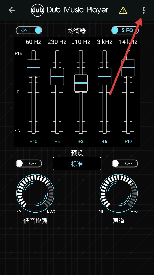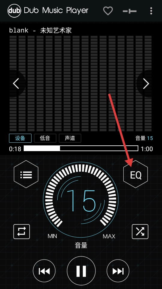 1、在Dub音乐播放器界面,点击【EQ】按钮,即可进入均衡器设置界面。