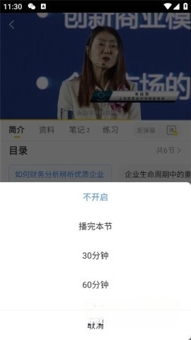 2、在设置界面选择关闭时间,可以选择播放完本节、30或60分钟后自动关闭。