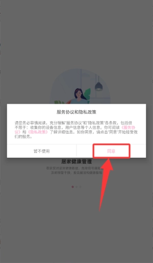 在服务协议与隐私政策提示框里点击“同意”按钮,就能进入家庭健康管理应用。