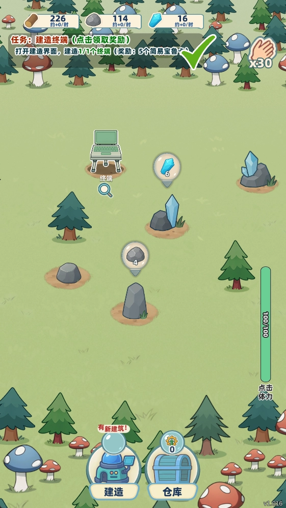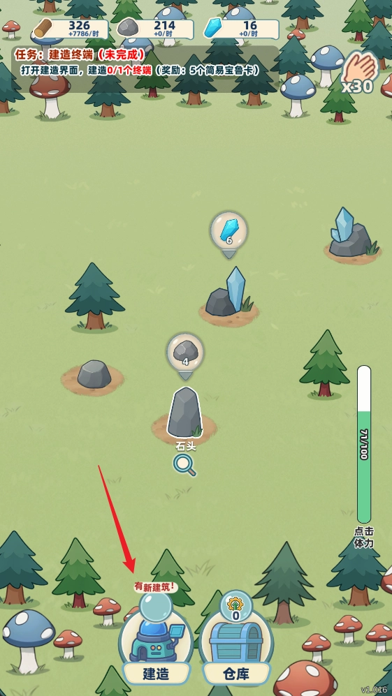 3、返回基地后,可点击地图里的树木或石头进行砍伐与开凿操作,以此快速获得建设所需的各类材料;