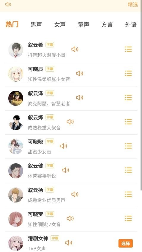 平台为你推荐的所有配音均为精选内容,你可以根据喜好自由挑选。