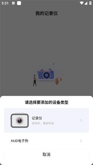 2、在设备类型选择界面点击“记录仪”选项,首次进行该操作时会弹出定位权限申请提示,同意权限请求后,按照添加向导的指引进入系统WiFi界面;