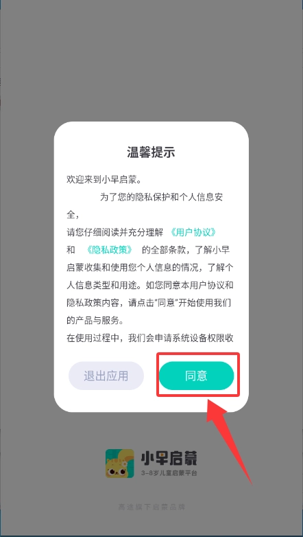 1、在温馨提示窗口点击“同意”按钮,就能进入小早启蒙应用。