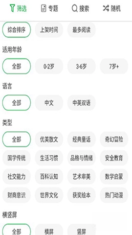 2、软件设有优美散文、阅读习惯等丰富分类,用户能够依据绘本的分类开展筛选操作。