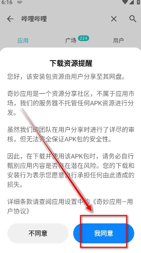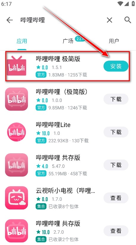 7.输入想要查找的软件或游戏名称,这里以哔哩哔哩为例进行演示,接着点击放大镜图标执行搜索,在搜索结果里找到自己需要的版本后,点击该版本对应的按钮即可。
