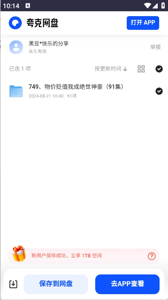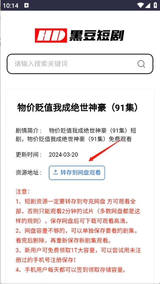 3、直接打开你喜欢的短剧资源后,点击“转存到网盘观看”按钮。