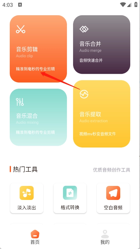 2、进入到首页,点击“音乐剪辑”。
