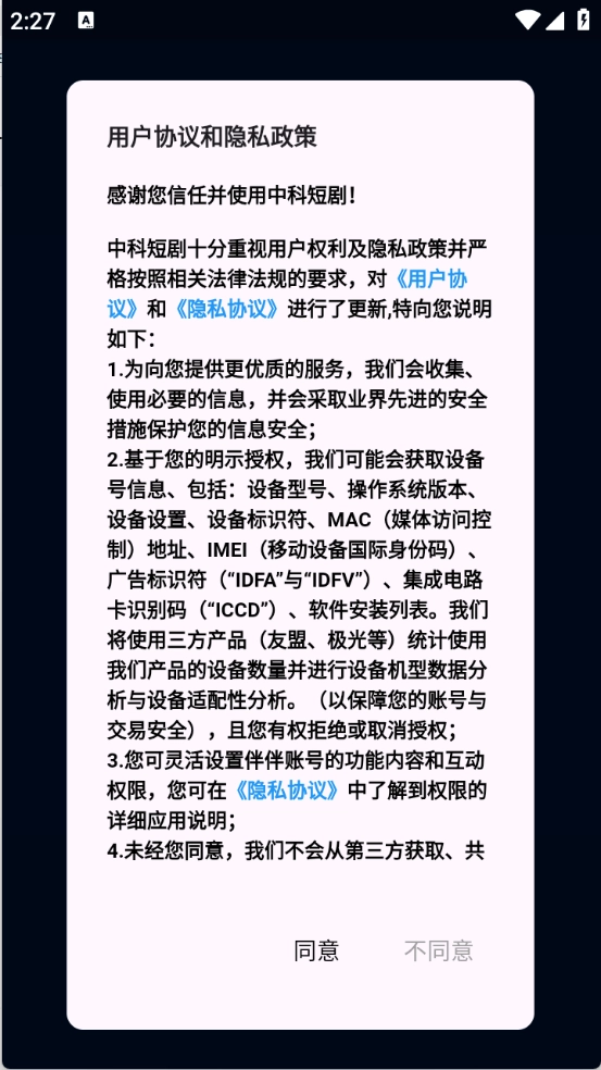 1、首先在本站中找到中科短剧,查看并同意隐私政策与用户协议。