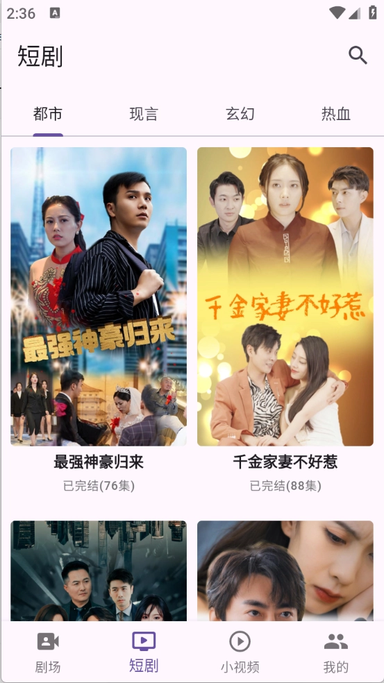 4、短剧栏目对短剧做了细致分类,涵盖都市、现言、玄幻等不同类型。