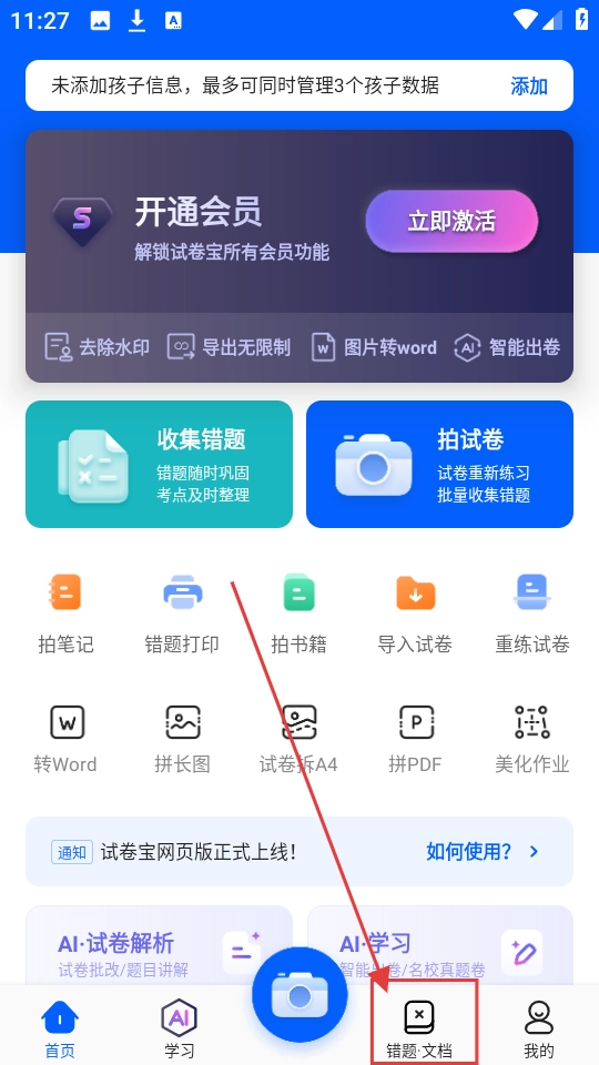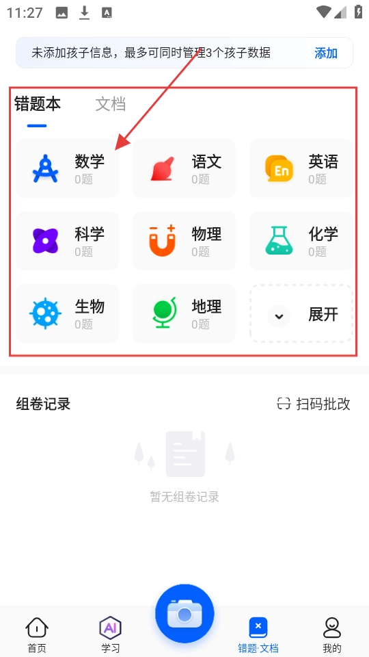 1、打开应用后,点击底部导航栏的【错题文档】选项,进入错题本页面,就可以开始选择对应学科来收集错题了。